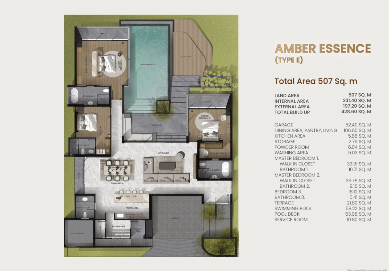 - Amber Essence (E): 3-bedroom, 4-bathroom villa on a 507 sq.m plot with 428.6 sq.m built-up area. Features 10m pool, high ceilings, and light-filled interiors.